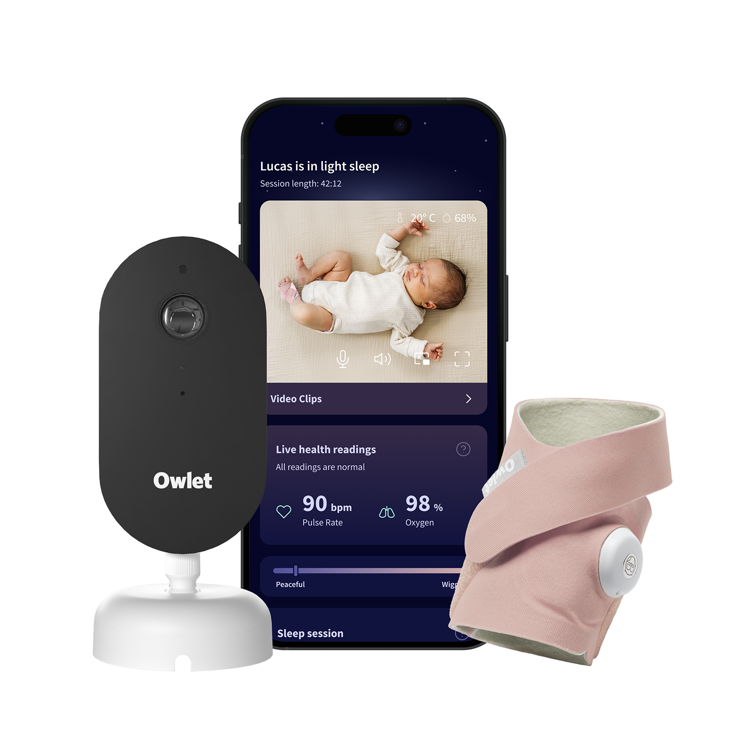 - Kövesse nyomon a baba pulzusszámát, az oxigénszint-, az ébredési és az alvási trendeket valós időben az Owlet Dream App segítségével.